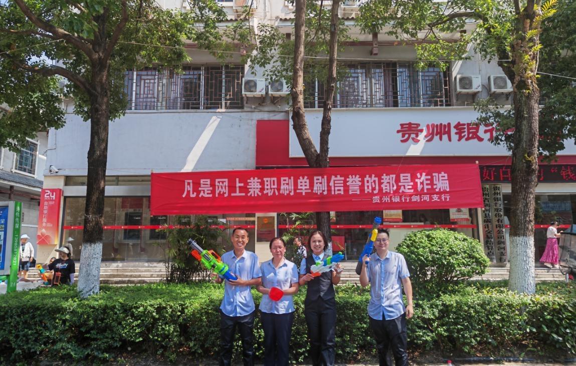 泼水狂欢带入反诈宣传。制作防水反诈宣传横幅、折页及定制泼水“反诈小水桶”,桶身印有“陌生链接不乱点”“转账汇款多核实”等简明反诈标语。同时银行工作人员加入泼水“混战”,在互动泼水中递送宣传品,让反诈提醒伴随清凉水花深入人心。